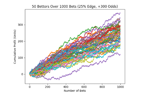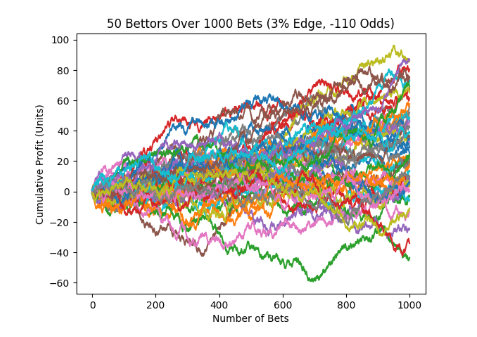 This first chart shows 50 random bettors if every single one only bet an edge of 3% at -110 odds. That is a great process and as you can see even after 1000 bets many of them will still be negative.